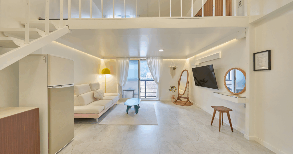 원룸, 복층, 패밀리룸, 커플룸 등 다양한 타입이 있고, 스파 객실과 감성 리모델링 객실도 있어요. OTT 서비스까지 제공해서 넷플릭스 보면서 쉴 수 있거든요. 1박 10-20만원대인데 시즌과 객실별로 변동이 있어요.