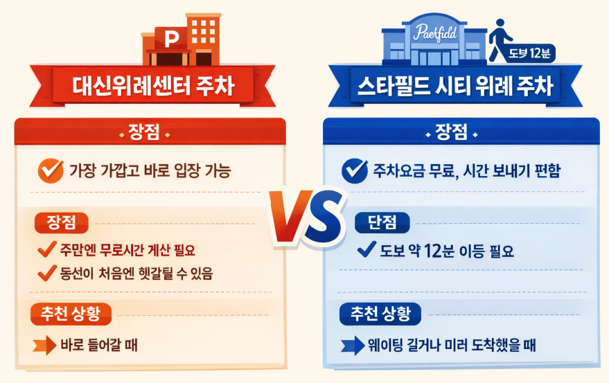 바로 입장 가능성이 높으면 건물 주차가 낫고, 대기 가능성이 크거나 일찍 도착했다면 스타필드 시티 위례 주차가 더 편한 선택이 될 수 있습니다.