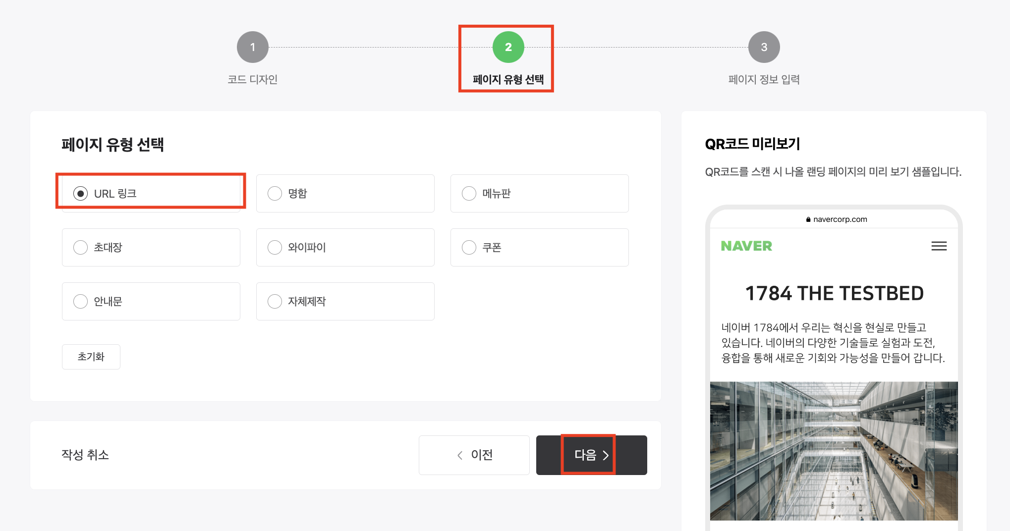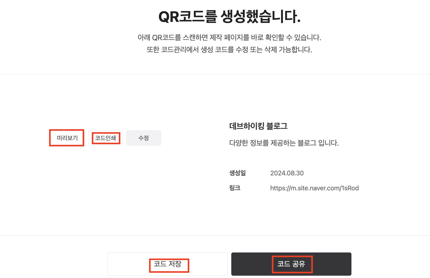 3. QR코드 생성이 완료되었습니다. "미리보기"를 선택하면 설정한 링크로 이동하는 것을 확인할 수 있습니다.