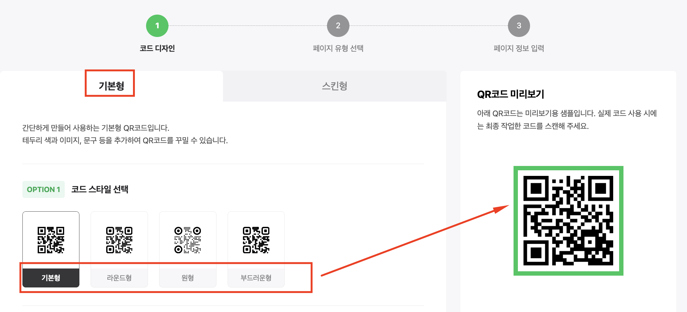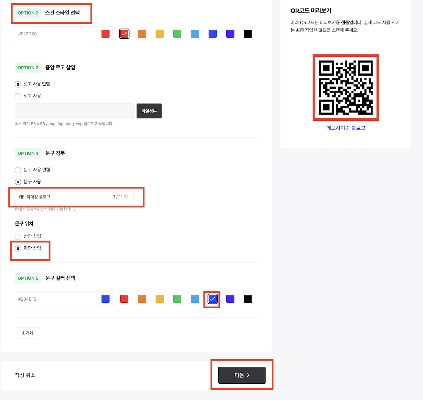 5. 이후 옵션은 동일합니다. "스킨 스타일 선택"에서는 QR코드 테두기 색상을 설정할 수 있습니다.