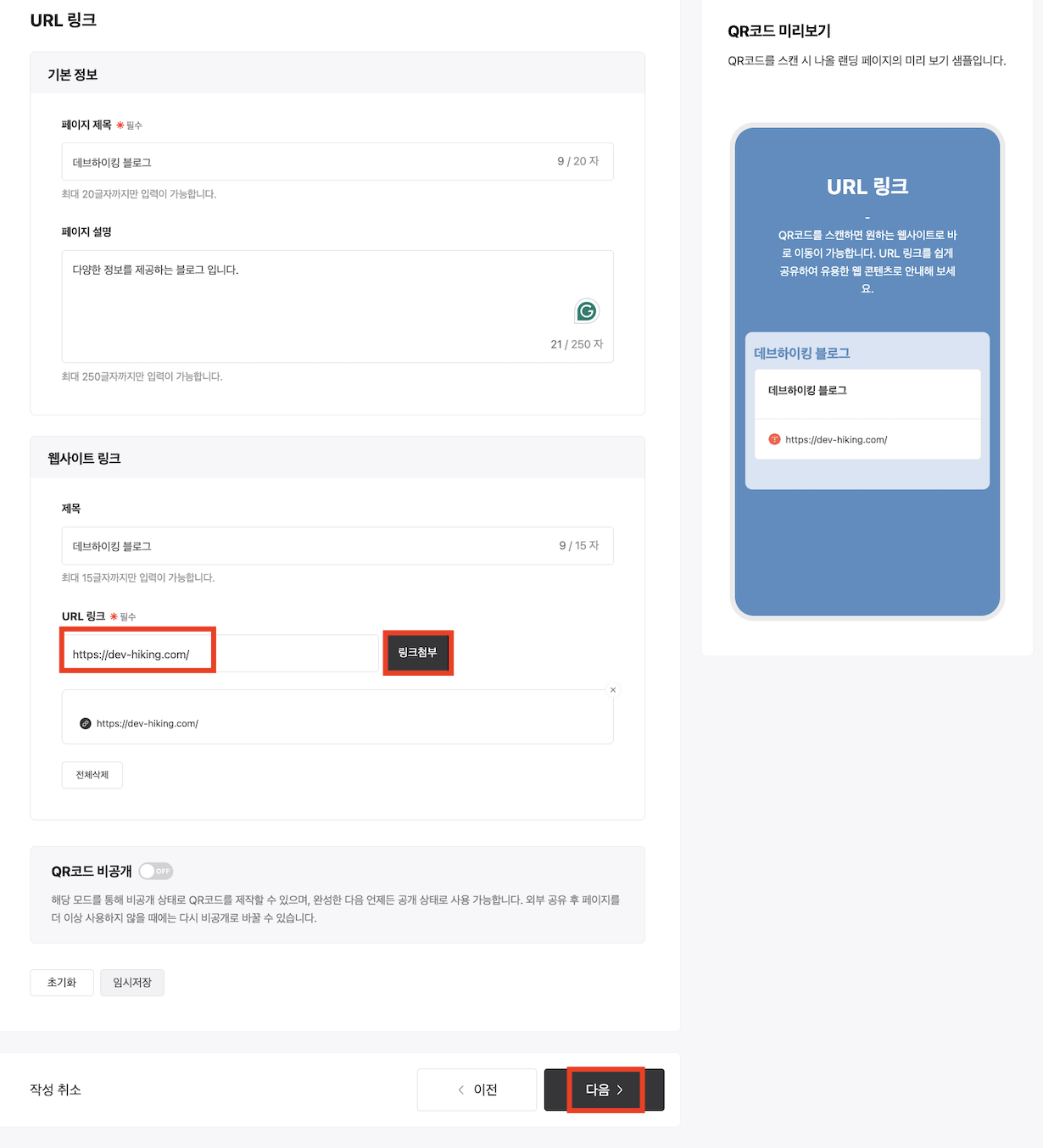 2. 여기서는 "URL 링크" 유형으로 진행 하겠습니다. 기본정보와 이동할 URL을 입력하고 "링크첨부"를 선택해서 추가합니다.