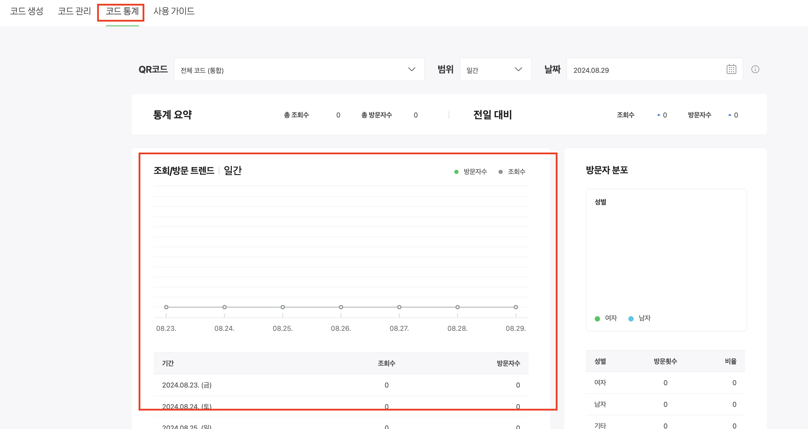 QR카드를 통해서 통계를 확인하고 싶으시면 "메뉴상단" - "코드 통계"를 통해서 가능합니다.