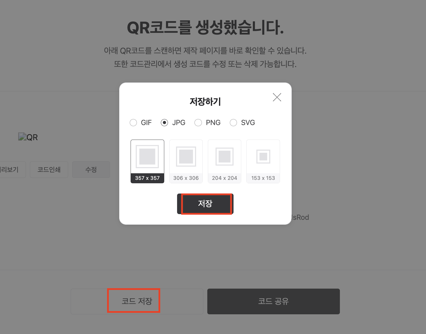 생성한 QR코드는 "메뉴상단" - "코드관리"에서 수정가능 합니다.
