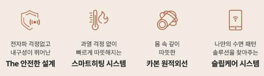 스마트히팅 케어 기술이 온도 편차를 실시간으로 감지해서 설정 온도를 일정하게 유지합니다. 카본 코팅 발열 방식으로 원적외선 온기가 몸 심부까지 부드럽게 전달되는데, 이건 찜질방의 온열침대처럼 피부에 얹히는 느낌이 아니라 속부터 따뜻해지는 경험이더라고요.