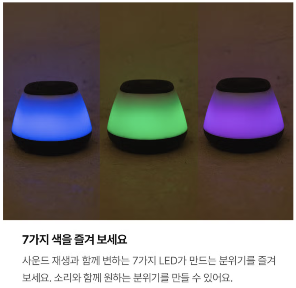 솔직히 말하면 디자인과 실용성 모두 나름의 매력이 있어요. 블루투스 5.0에 Micro SD 단독 재생까지 되니까 스마트폰 없이도 음악을 들을 수 있거든요. 특히 7색 LED가 상단과 측면으로 퍼지는 효과가 일반 스피커와는 확실히 달라요.