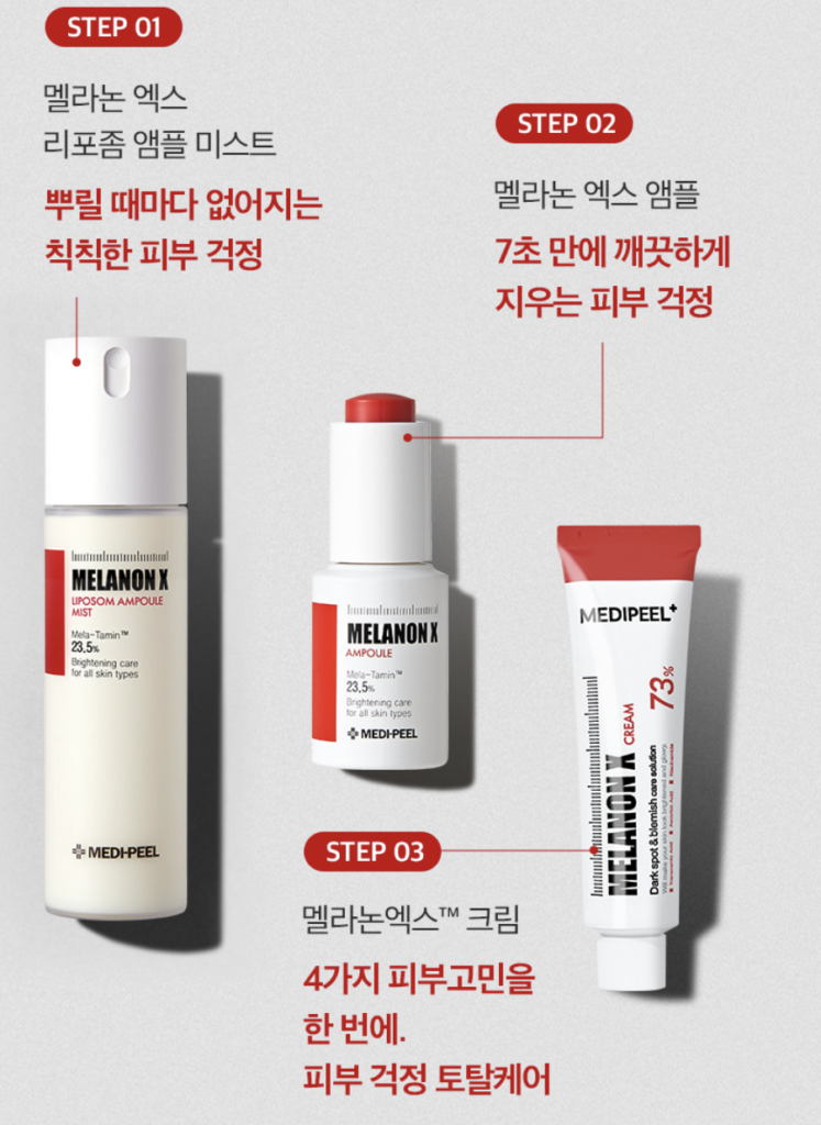 - 멜라논엑스 리포좀 앰플 미스트 → 2. 멜라논엑스 앰플 → 3. 크림 (건조함·칙칙함·스팟을 동시에 공략하는 세트 구성)