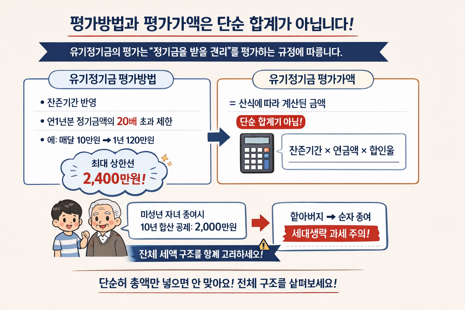 가장 어려워하는 부분이 바로 평가가액이에요. 유기정기금은 상속세 및 증여세법 시행령상 "정기금을 받을 권리"를 평가하는 규정이 있고, 잔존기간에 각 연도에 받을 금액을 기준으로 합산하되 1년분 정기금액의 20배를 초과할 수 없도록 되어 있습니다.