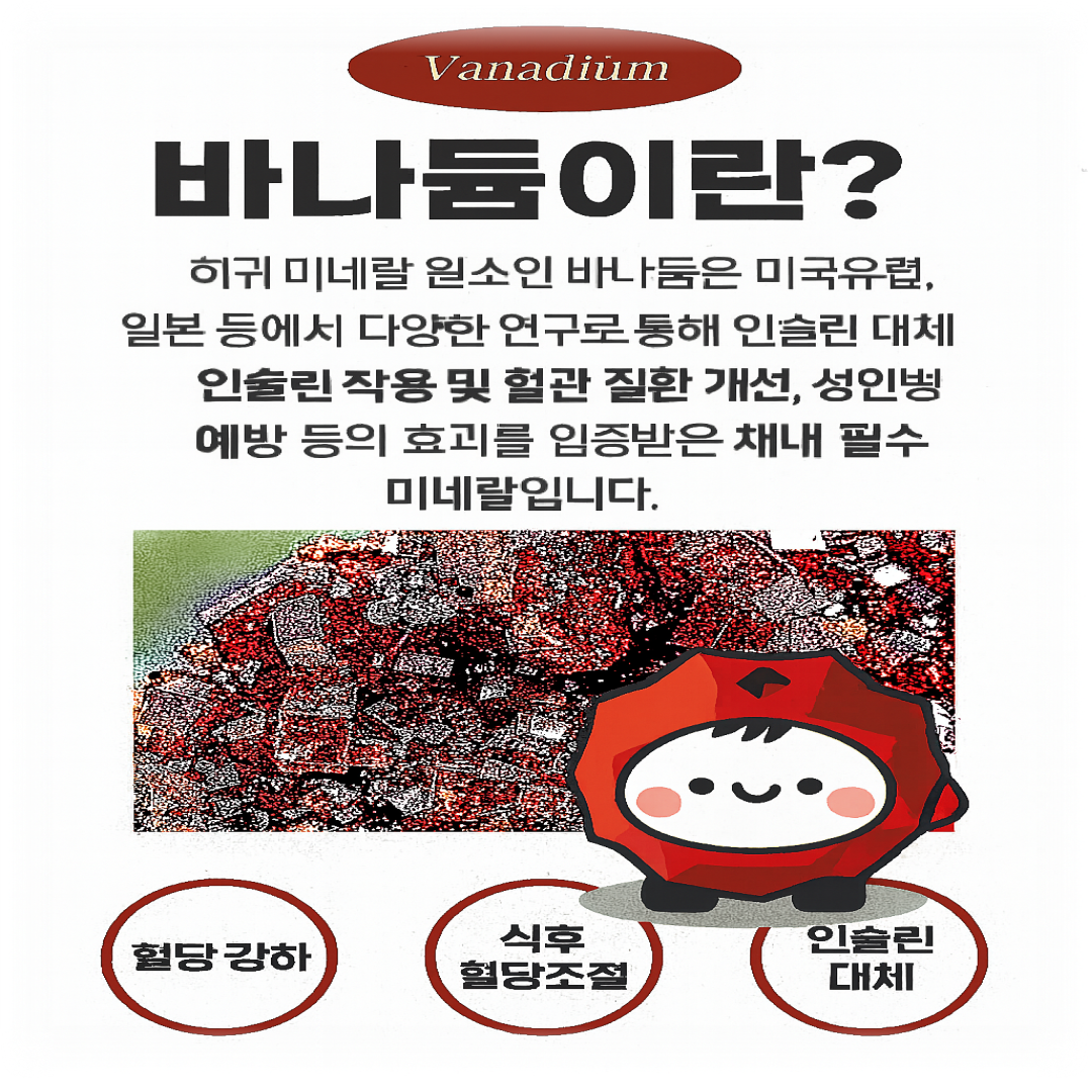 바나듐쌀은 '혈당 도우미', '혈당 강화'로 불릴 만큼 혈당 상승 억제와 인슐린 유사 작용이 있어요. 미국, 일본, 유럽에서도 다양한 연구가 이루어졌으며, 혈당 강화, 성인병·혈관질환 예방, 뼈 건강, 암 화학 예방 가능성도 언급되고 있더라고요.