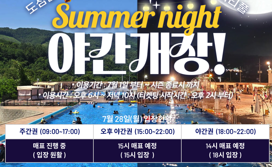 경기 양주시 장흥면 유원지로에 있는 이곳은 2025년 7월 25일부터 8월 23일까지 18:00부터 22:00까지 운영해요. 야간 1인 10,000원 정액이고 사전 예매 할인도 있어요. 취사 가능하고 주차는 무료예요.