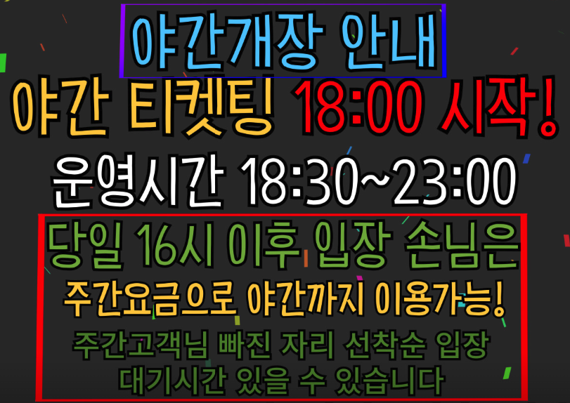 야간권과 주간권 가격이 다른지 궁금해하시는 분들이 많은데, 대부분 야간권이 조금 더 비싸거나 비슷해요. 일부는 할인해주는 곳도 있으니 미리 확인해보세요.