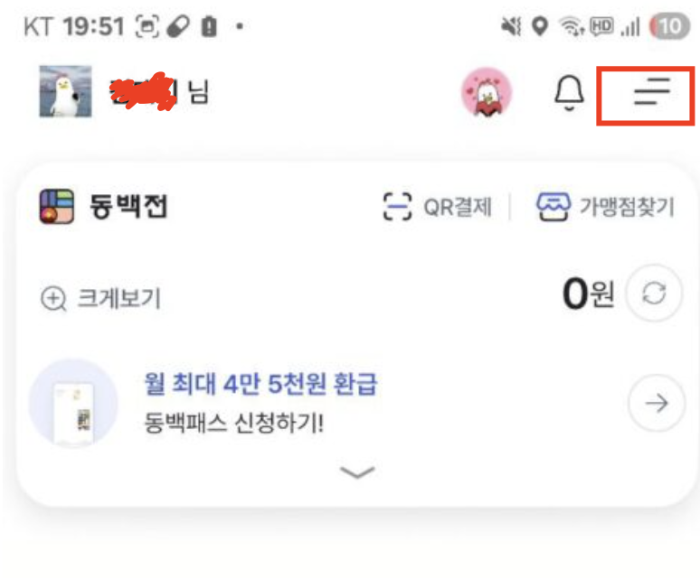 2단계: 회원가입 후 메인 화면 우측 '메뉴' 선택