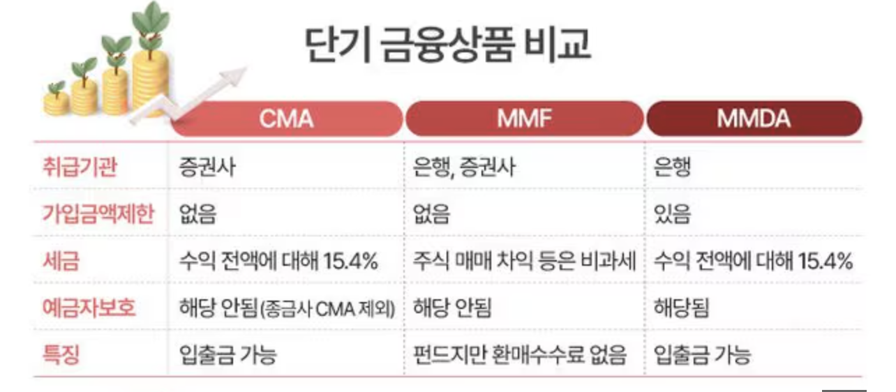 은행에서 가입할 수 있는 단기 금융상품 중 하나는 MMDA예요. MMDA는 투자 금액이 많을수록 더 유리하답니다. 보통 500만 원 이상의 목돈을 운용하기에 적합해요. 이 상품은 은행 상품이기 때문에 예금자 보호법이 적용되어 안정성이 높아서 마음 놓고 투자할 수 있어요. 다만, MMDA는 다른 단기 금융상품에 비해 수익성이 조금 낮은 편이에요.