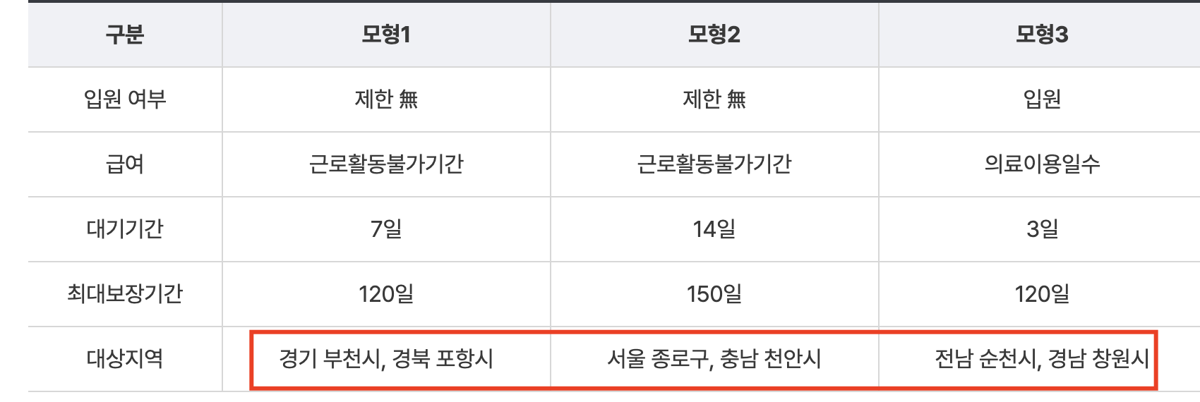 현재는 시범사업이기 때문에 지역별로 5개의 모형으로 구분해서 적용하고 있는데요. 그래서 조건 및 최대 보장기간이 다를 수 있으니 꼭 참고 하시기 바랍니다.