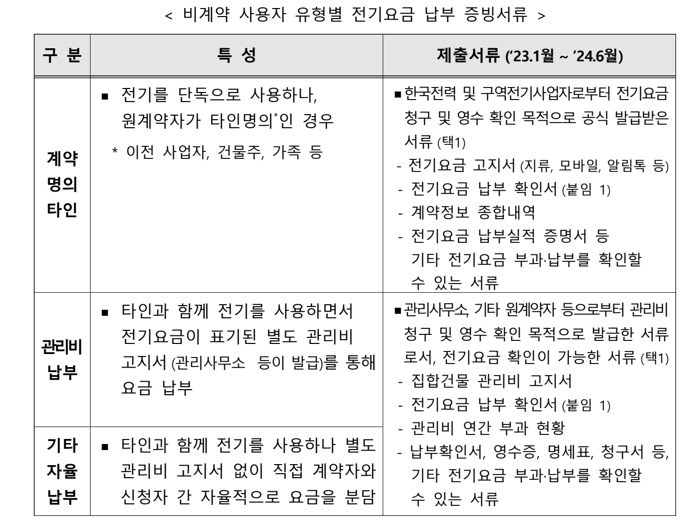 • 비계약사용자(‘24.3.4.~예산 소진 시까지) : 한국전력과 직접 전기사용계약을 체결하지 않고 전기를 사용하는 자(계약명의타인, 관리비납부 등)