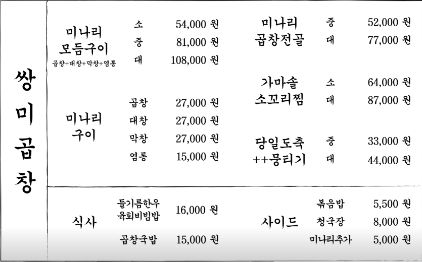 - 미나리 모듬구이 27,000원: 한우 곱창·대창·막창·염통을 미나리와 함께 즐기는 대표 메뉴