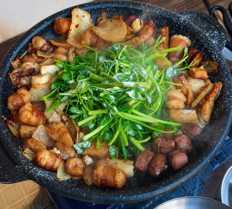 가장 기대했던 메뉴였고 기대를 어느 정도 충족시켜준 메뉴였습니다. 초벌되어 나와서 어느 정도 시간이 지나면 바로 먹기 좋은 상태가 됩니다. 미나리가 수북하게 올라가 있고 감자, 양파, 마늘도 함께 나옵니다.