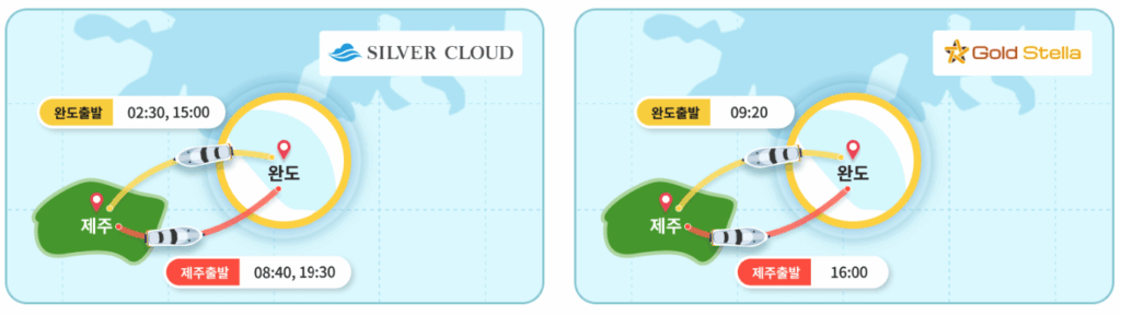 하루에 2-3회 운항하는데, 골드스텔라는 완도발 09:20, 제주발 16:00이고요. 실버클라우드는 완도발 02:30/15:00, 제주발 08:40/19:30이에요. 새벽 시간대도 있어서 일정 맞추기가 생각보다 수월해요.