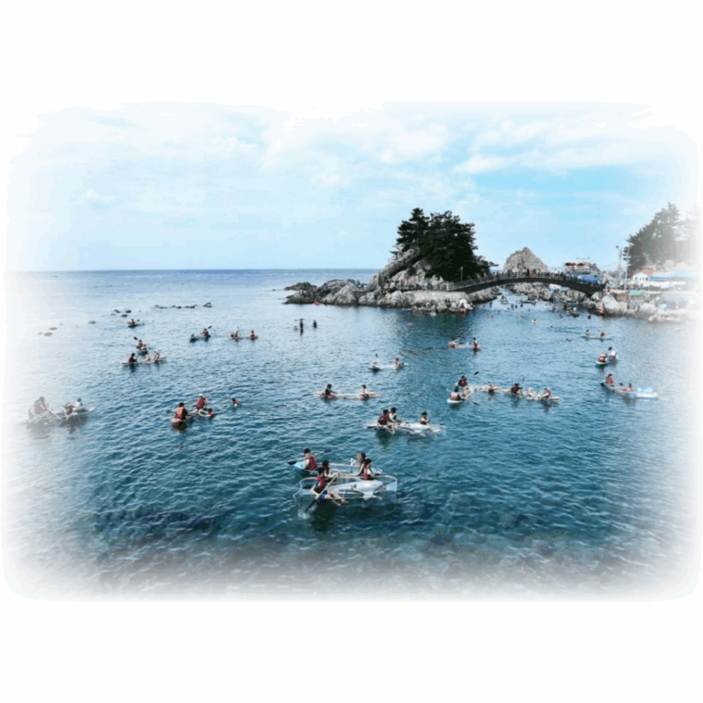 스노클링만큼이나 인기 있는 게 투명카누 체험입니다. 2인 기준 25,000원으로 30분 동안 즐길 수 있거든요. 바닥이 투명해서 바닷속 풍경을 그대로 볼 수 있다는 게 정말 매력적이더라고요.