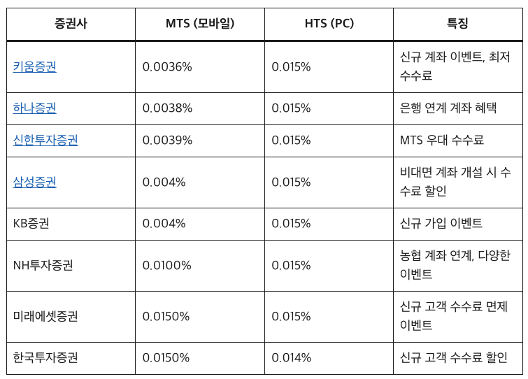 제가 실제로 여러 증권사 수수료를 비교해본 결과예요. 7월 기준으로 정리했는데 정말 차이가 많이 나더라고요. 대부분 비대면 계좌 신규나 휴면 고객 이벤트 적용 시 수수료가 대폭 할인되더라고요.