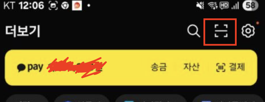 카페나 일부 식당에서 테이블에 QR코드가 붙어있는 거 보셨을 거예요. 카카오페이에서 'QR 촬영' 선택하고 그 코드를 카메라로 찍으면 금액 입력하는 화면이 나와요.