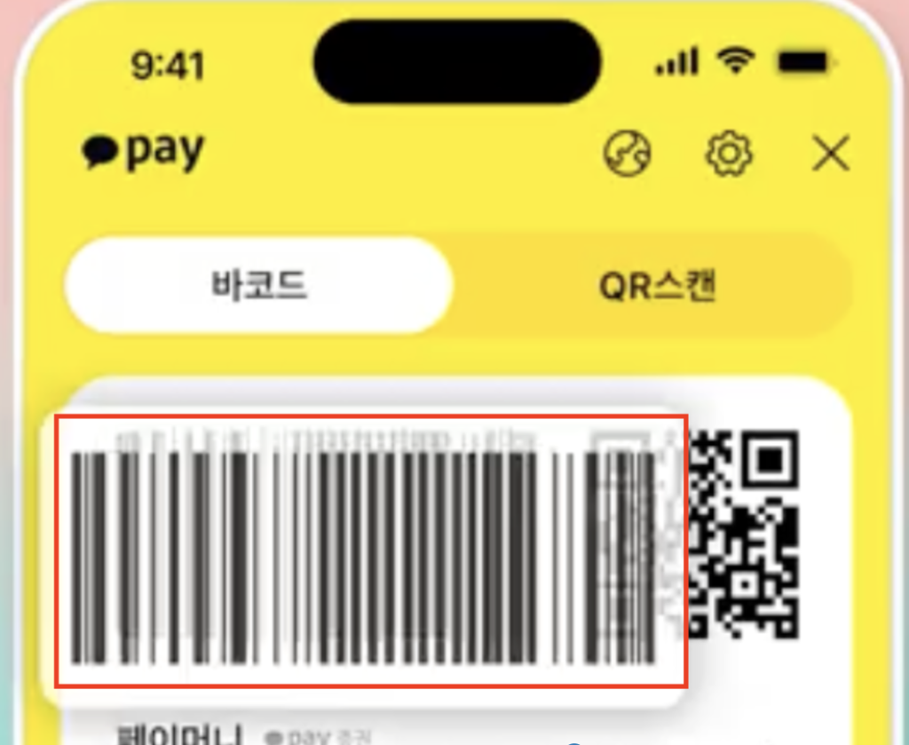 가장 많이 쓰게 될 방법이에요. 카카오톡 실행해서 Pay 메뉴 들어가면 '결제' 버튼이 보일 거예요. 누르면 바코드가 뜨는데, 이걸 매장 직원에게 보여주기만 하면 끝이에요.