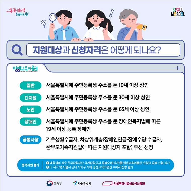 일반, 디지털, 노인형은 서울시 평생교육이용권 누리집에 접속해서 신청하면 되는데, 장애인형만 정부24 누리집에서 서울시 장애인 평생교육이용권을 검색해서 신청해야 해요.