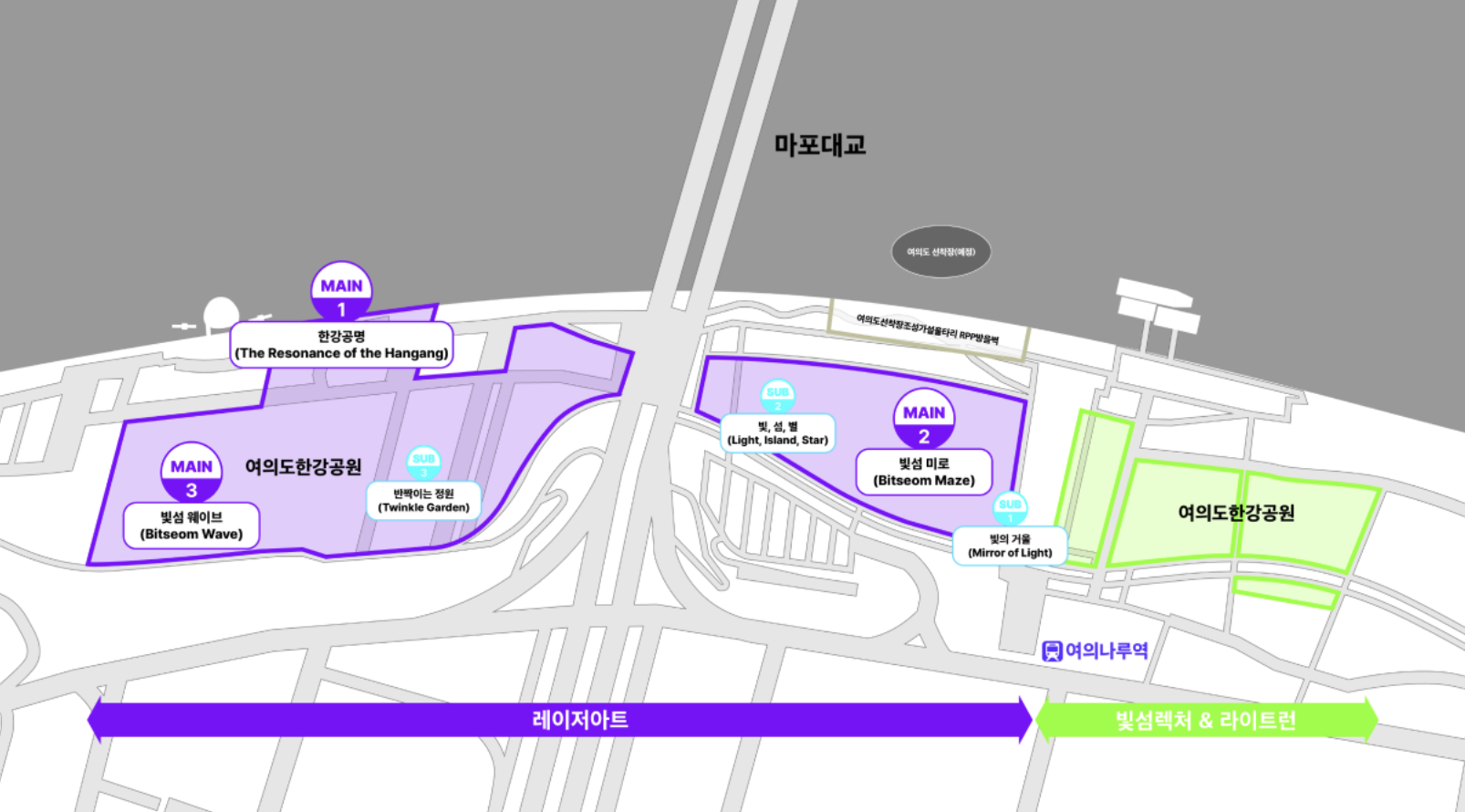 프로그램은 3개로 구성되어 있는데요. "레이저 아트전시"는 레이저와 미디어 아트가 융합된 멋진 형태로 선보일 예정인데요, 한강에 띄운 배 위에서 펼쳐지는 레이저 작품과 EDM 공연이 함께 진행될 예정입니다. "라이트 런"은 빛을 내는 봉을 들고 10월 12일 밤에 5㎞ 코스를 달리는 체험입니다. 운동대회보다는 마치 움직이는 작품을 모든 참여자가 만드는 체험입니다. 마지막으로 "빛 섬 렉처"는 빛과 미디어 아트 작품, 그리고 관련 신기술을 소개하는 짧은 야외 강연입니다.