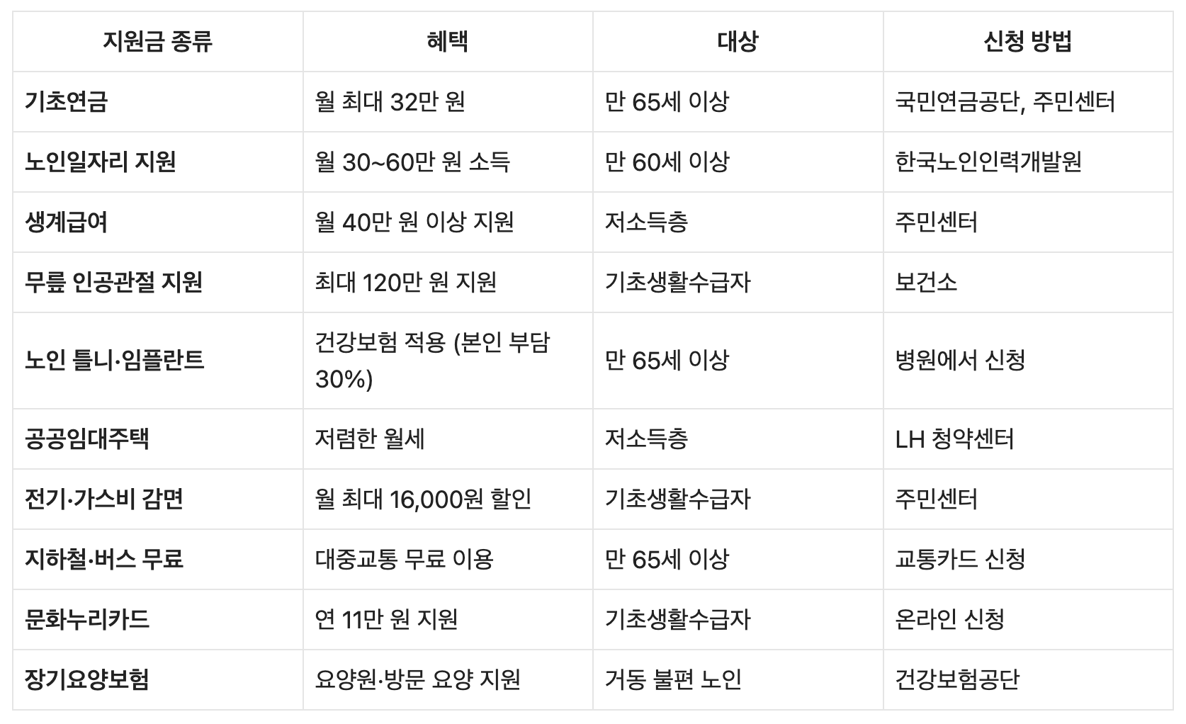 - 대상: 만 65세 이상, 소득·재산 기준 충족 시