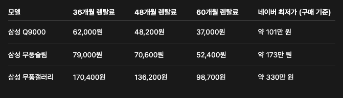 각 모델별 렌탈 가격을 비교해보면 장단점을 더 명확히 파악할 수 있습니다.