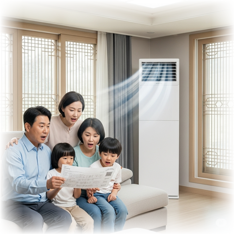 천장에서 부드럽게 내려앉은 냉기가 실내 전체를 골고루 채우면 마치 냉장고 안처럼 균일하게 시원해져요. 이렇게 되면 설정 온도에 더 빨리 도달하고 실외기도 쉬게 되어 전기요금이 크게 줄어들어요.