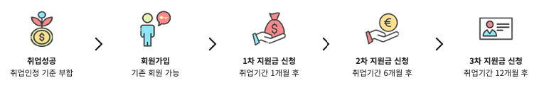 구분지원 시기지원 금액1차취업 후 1개월 이후250만원2차취업 후 6개월 이후100만원3차취업 후 12개월 이후150만원