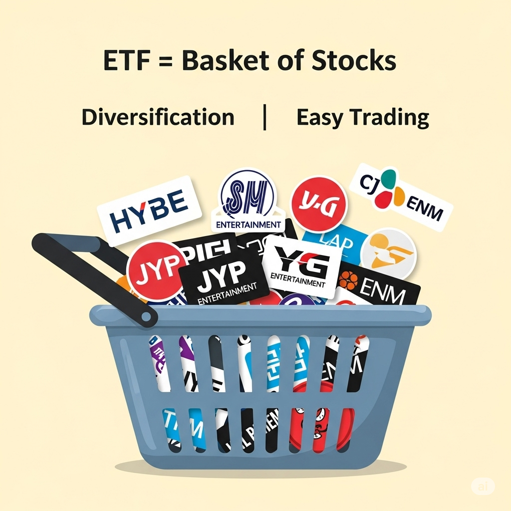 처음에는 ETF가 뭔지도 몰랐거든요. 간단히 말하면 여러 주식을 한 바구니에 담아서 패키지로 만든 상품이에요. 예를 들어 하이브, SM, JYP 같은 기획사 주식들을 각각 사려면 돈도 많이 들고 복잡한데, ETF 하나만 사면 이런 회사들에 한 번에 투자할 수 있는 거죠.