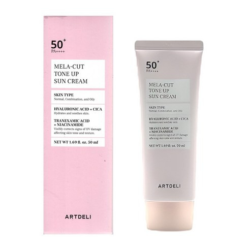 아트델리 멜라 컷 톤업 선크림은 화해 등록 정보 기준 SPF50+/PA++++·미백·주름개선 기능성 성분이 함께 표기돼요.