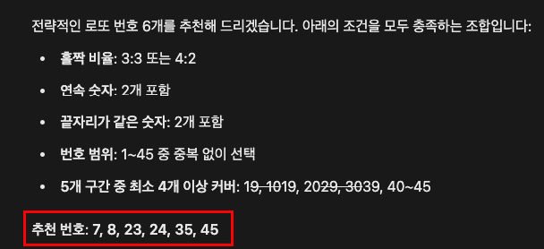 • 전략적 선택: AI의 설명을 검토하고 제시된 전략이 본인의 로또 구매 성향과 일치하는지 확인합니다.