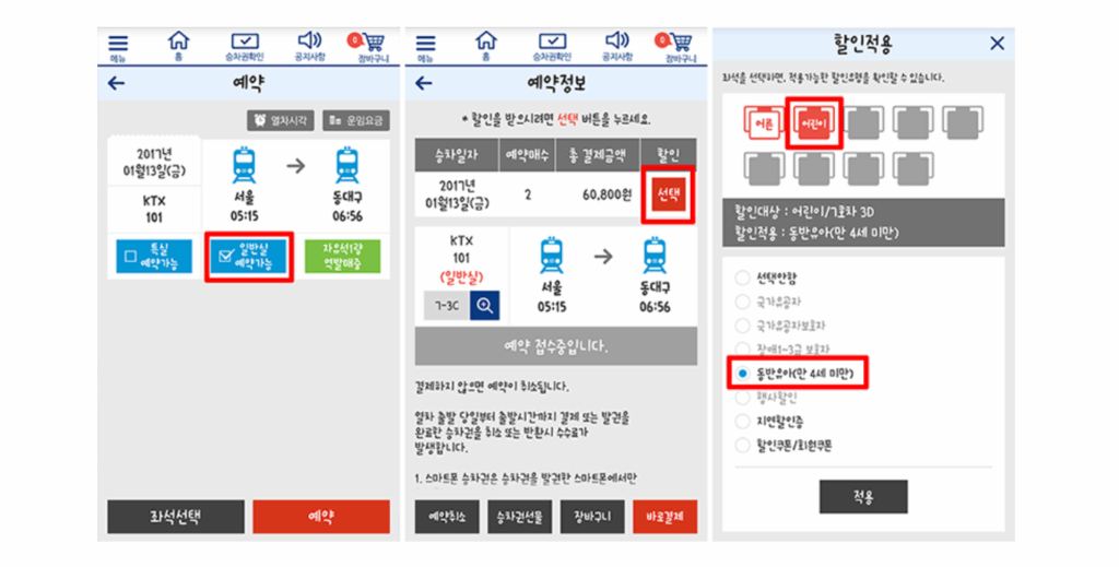 - 자유석: KTX-이음, KTX-산천 일부 열차에 있음 → 빈자리 앉기 가능