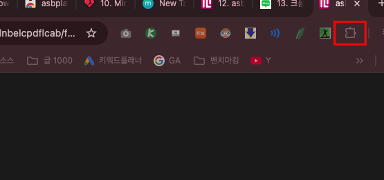 우측 상단에 퍼즐 모양의 확장 프로그램 관리 아이콘을 선택해서 'asbplayer' 확장 프로그램이 있으면 설치가 정상적으로 된 거예요.