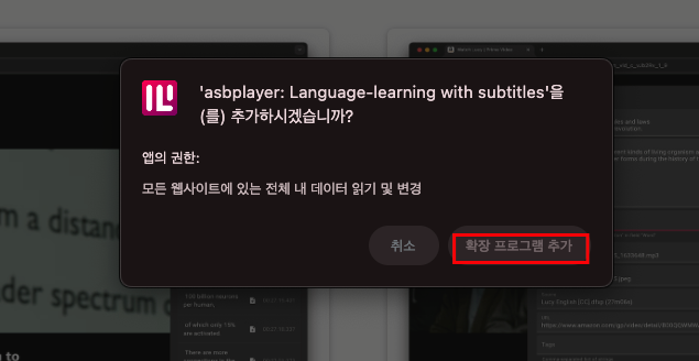 크롬 웹스토어에서 asbplayer를 검색하시거나 직접 설치 페이지로 이동해서 우측 상단 'Chrome 추가' 버튼을 선택하세요. 그 다음 '확장 프로그램 추가'를 선택하시면 설치가 완료돼요.