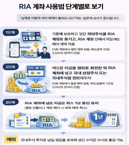 - 1단계: 기존에 보유하고 있던 해외주식을 RIA 계좌로 옮기고, RIA 계좌 안에서 직접 매도해야 혜택 적용 (다른 계좌에서 팔면 혜택 없음, 매도금액 1인당 5,000만 원까지 인정)